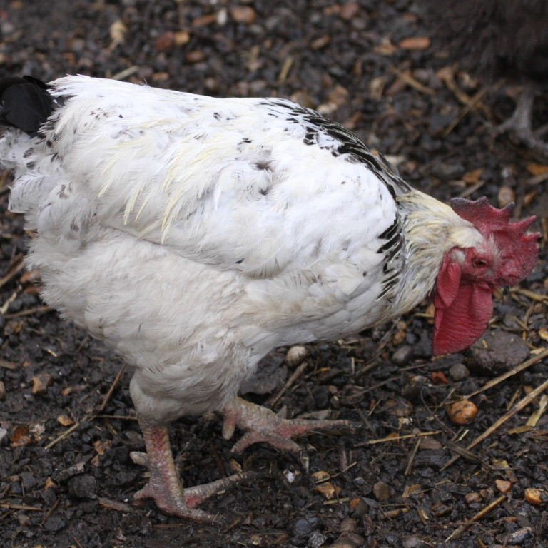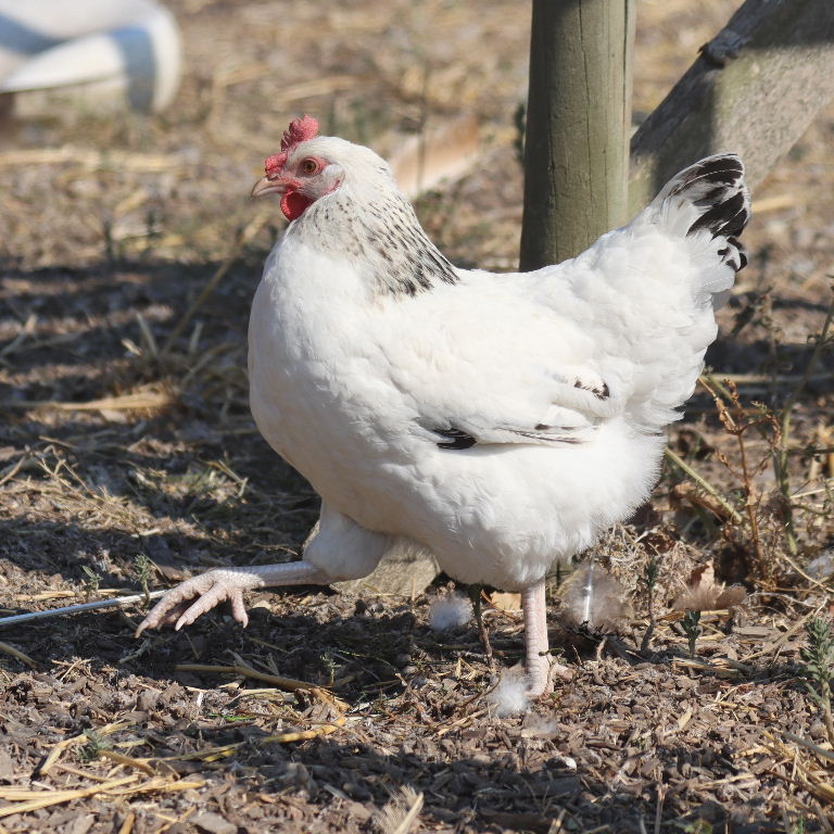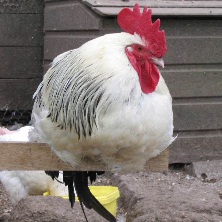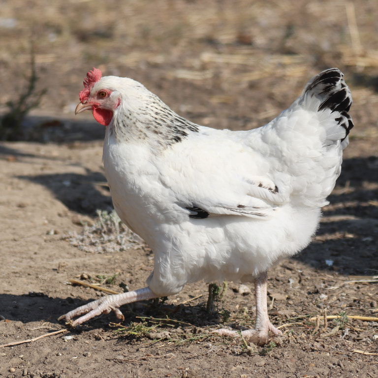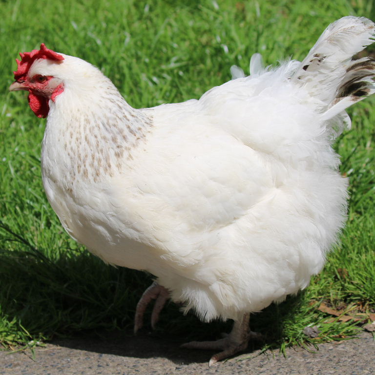 The Light Sussex has mainly white plumage with a black-streaked neck and black tail and wing tips.