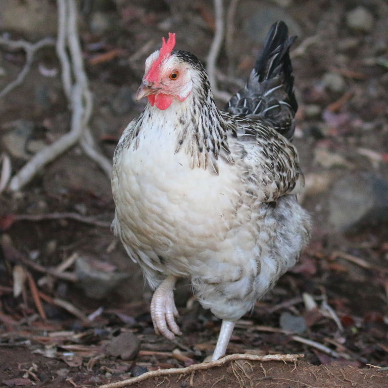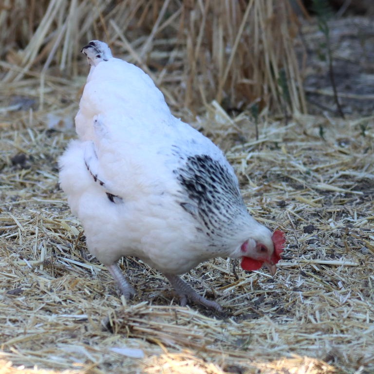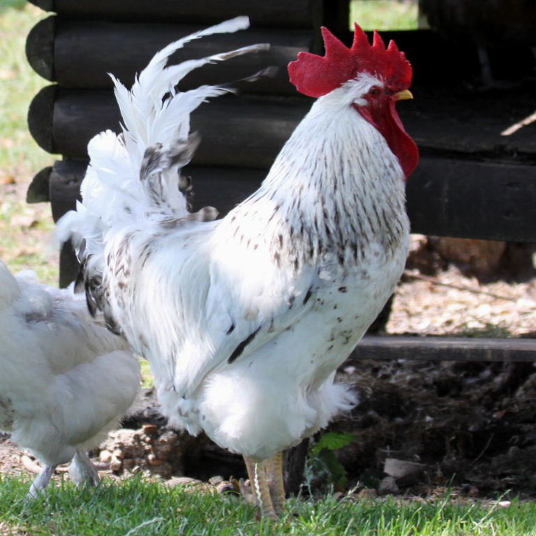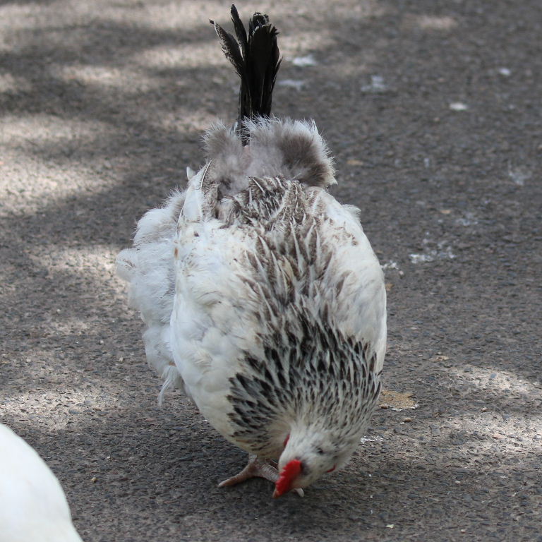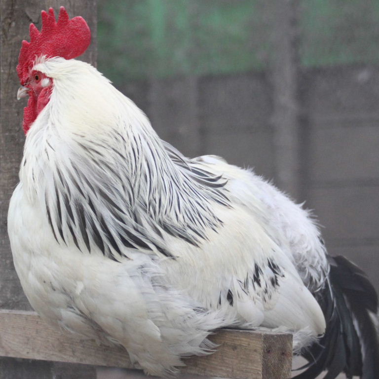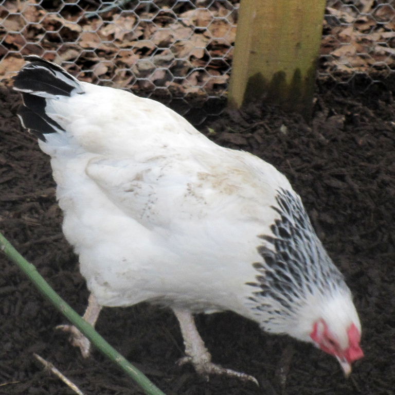 The Light Sussex has mainly white plumage with a black-streaked neck and black tail and wing tips.