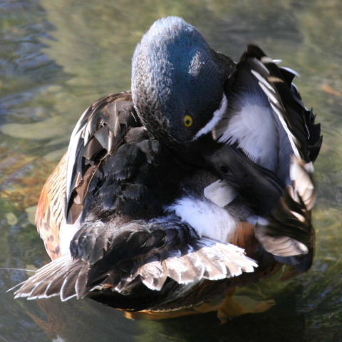 This duck appears to be a hybrid between a Northern Shoveler and an Australasian Shoveler. He was in a group of Northern Shovelers.