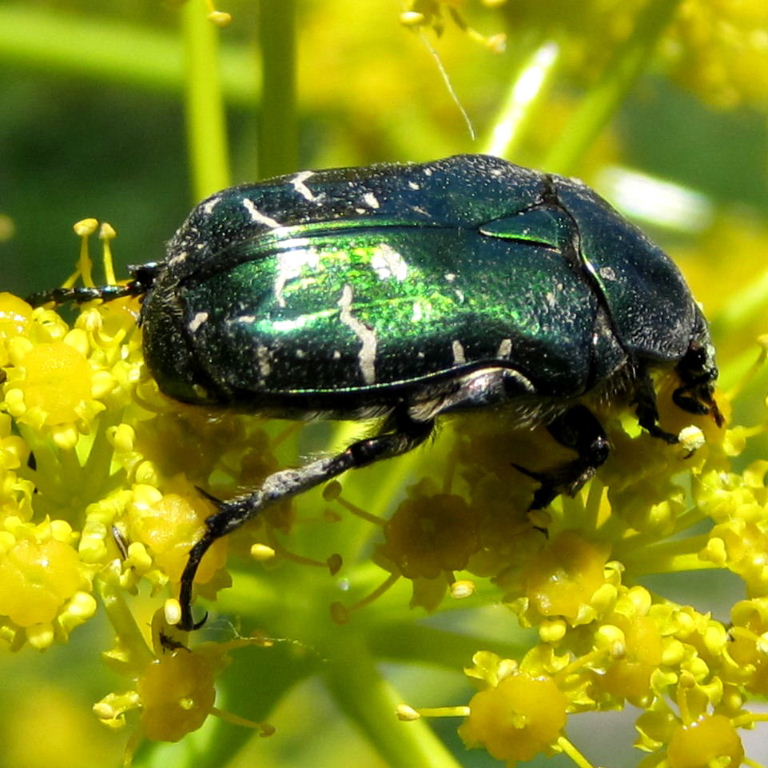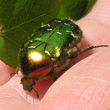 This beautiful gem is a Rose Chafer beetle. The iridescent metallic colour changes between green and gold depending on the light and angle.